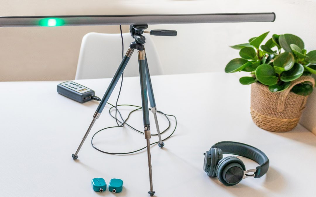 Ik stelde haar wat vragen en deed de intake, daarna mocht ze plaats gaan nemen achter de “magische” lamp (niks magisch aan hoor ), de koptelefoon werd op haar hoofd gezet en de trilblokjes in haar handen. We gaan beginnen…